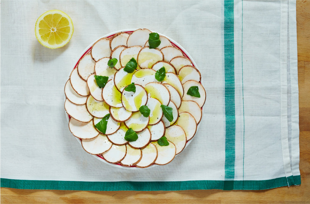 Overlapping mushroom slices of Creminis make for a gorgeous presentation. The easiest way to create this is with a mandolin because you want the mushrooms sliced very thinly. Hold each one by the stem and use mandolin to cut very thin slices off top of mushroom cap. Stop before you reach stem. Save stem ends (they will still have some of cap attached) for soup or making stock. If you don’t have a mandolin, use a large, sharp knife. Remove stems from mushrooms. Lay each cap flat on cutting board and trim one edge, slicing off ⅛ inch or so. Turn cap on its edge so cut side is flush against board. This way, mushroom remains steady. Slice as thinly as you can. Arrange on two plates in overlapping concentric circles. Season with sea salt and pepper. Tear basil and scatter over mushrooms. Just before serving, finish each plate with a generous squeeze lemon and drizzle of olive oil.