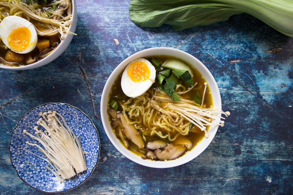 Simmer another 10-14 minutes. Meanwhile bring a medium pot of water to a boil cook noodles (if using) for 1 minute, drain and divide between two bowls. Pour Broth in the bowls, top with bok choy, egg and a drizzle of sriracha (optional).