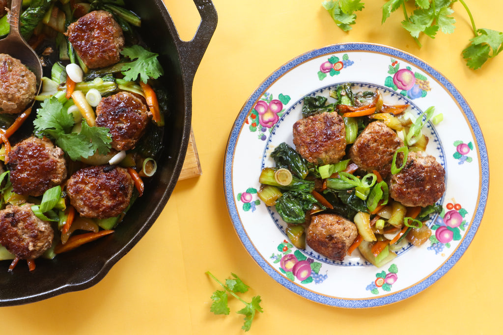 Drain excess fat, but leave some meat drippings and light coating of oil in skillet. Add bok choy stems and sauté 2 minutes. Next, add bok choy leaves as well as rest of scallions, carrots, and garlic; and sauté 2 more minutes. Place meatballs back into skillet.
