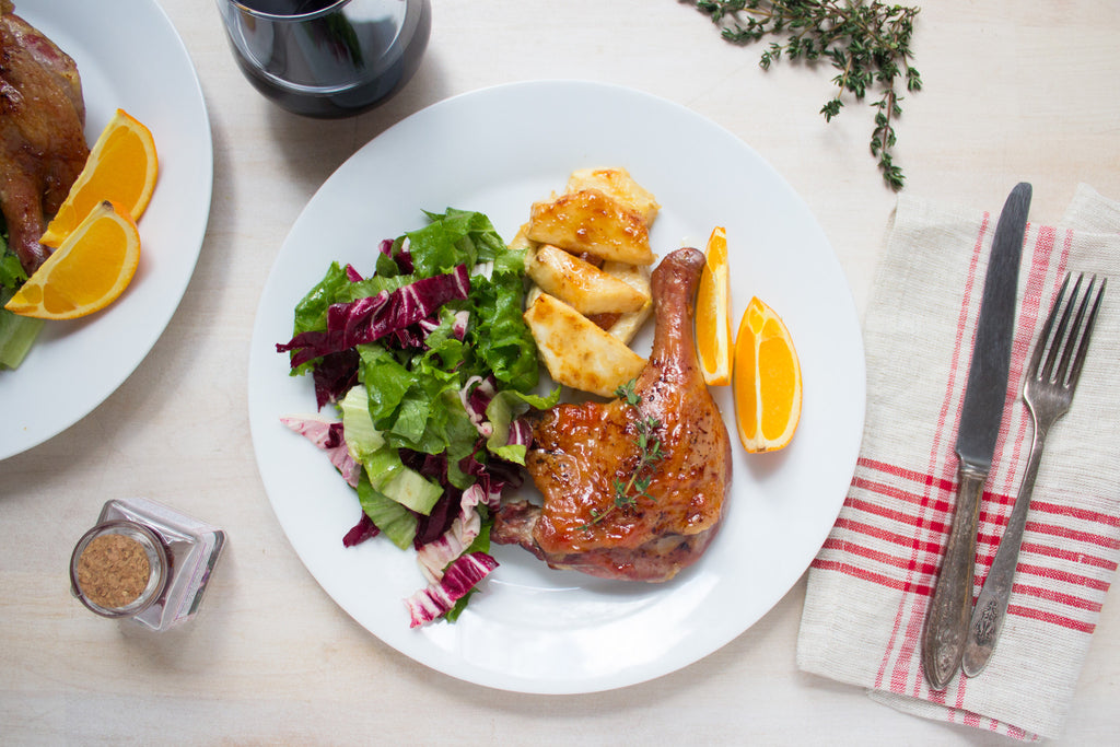 Using a sharp knife, score the skin of each duck leg into a diamond pattern. Sprinkle with a pinch of salt and pepper on each side. Preheat the oven to 375 degrees. Lay the duck legs, skin side down, in a cold oven proof pan and place over medium flame. Slowly render the fat until the skin is crisp and golden brown, about 12-15 minutes.