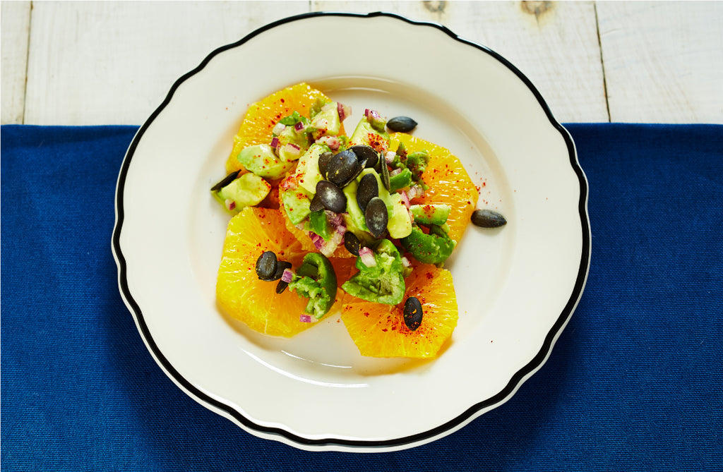 Cut the tops and bottoms off the oranges and cut away all the peel and white membrane from the outside of the oranges. Cut them into slices and arrange on two plates. Drizzle with a bit of olive oil and season with salt and pepper and a pinch of cayenne. Smash each olive with the bottom of a glass and remove the pit. Chop the olives roughly. Combine with the avocado and red onion. Season with salt, a squeeze of lemon and a bit of olive oil. Divide the olive and avocado mixture between the two plates and garnish each plate with the pumpkin seeds.