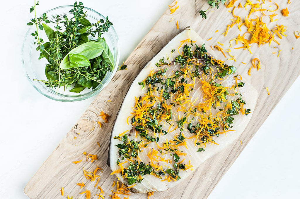 In a small bowl, combine the orange zest, orange juice, olive oil, minced garlic, fresh thyme leaves, salt, and pepper. This will be the marinade for your swordfish.