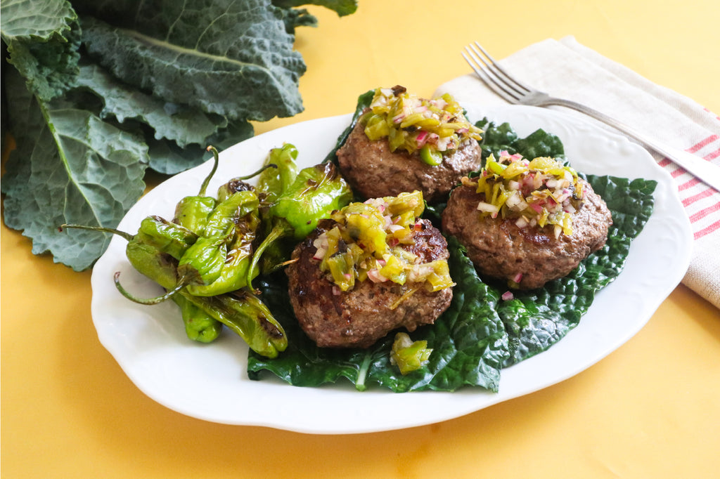 Heat the same cast-iron skillet over high heat. Add the lamb burgers and cook for about 2 to 3 minutes on each side for medium. Remove lamb and add kale leaves to pan. Sear until just wilted and slightly brown. Place each lamb pattie on a kale leaf, top with shishito relish, wrap in leaf and serve.