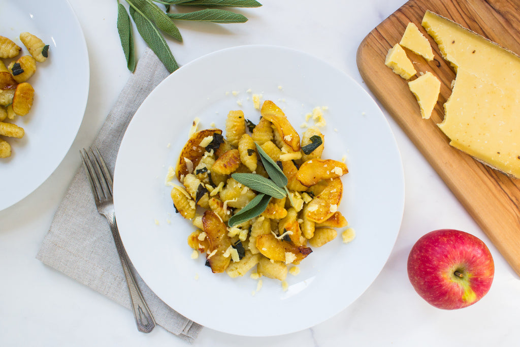 In large sauté pan, over medium heat, melt butter. Add sage and stir 30 seconds, until fragrant. Add apples and cook 5 minutes, stirring often, until slightly cooked through. Remove to bowl. In same pan, over medium flame, heat oil until hot. Add gnocchi and cook without moving 3 minutes to brown on one side. Carefully flip gnocchi with spatula and season with pinch sea salt and pepper. Continue to cook 3 minutes until browned on both sides. Add apples and stir to combine. Divide between 2 plates and top with shaved cheese.