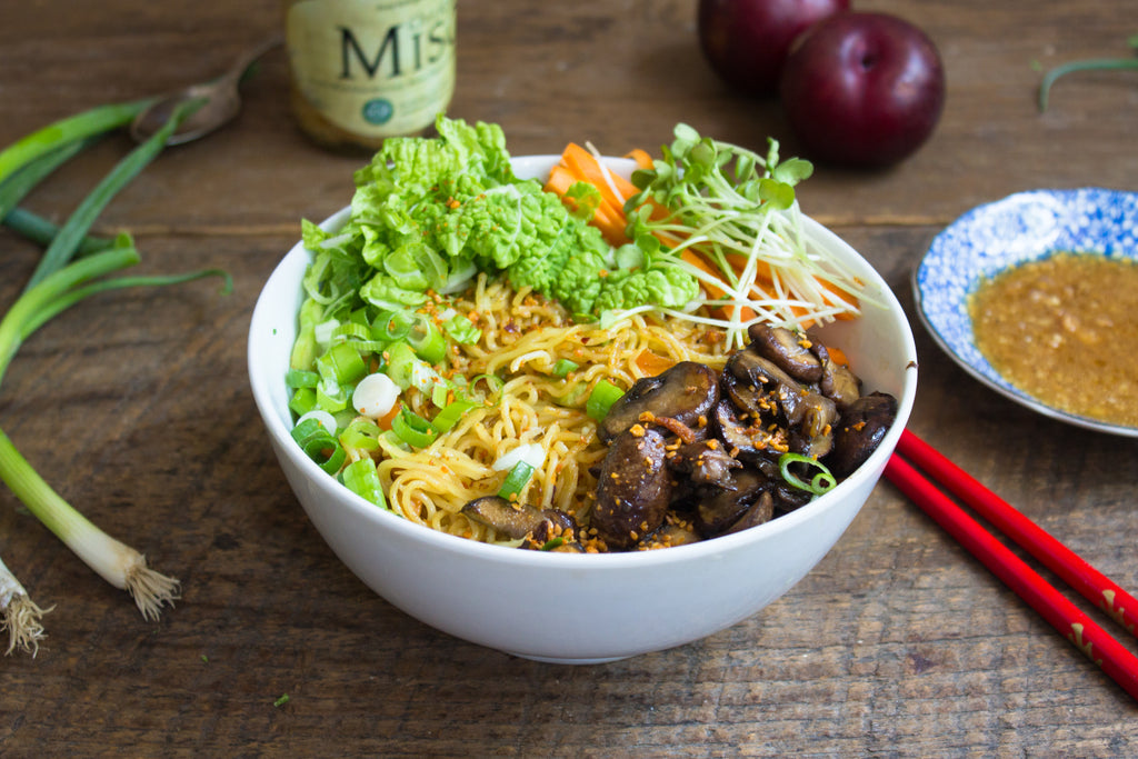 In same sauté pan used for mushrooms, heat remaining oil over high heat. Add cabbage, half of scallions and a pinch of salt. With a wooden spoon, stir and shake the pan constantly, until vegetables are tender, about 3 minutes. Add noodles, garlic and eggs. Cook 3 more minutes, stirring only once. In a small bowl, whisk miso into soy sauce and add to noodles. Stir until coated. Divide among 2 shallow bowls. Garnish with rest of the scallion.