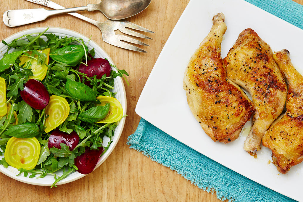 Preheat the oven to 400 degrees. Wash the beets and pat them dry. Wrap them in a packet of foil. Place the packet on a baking sheet and bake the beets until soft, about 15-20 minutes. Meanwhile, season the chicken legs & thighs with salt and pepper. Heat the ghee in an oven-safe sauté pan over medium-high heat. Just before it begins to smoke, place the chicken in skin side down and allow the outside to begin searing. Do not move the pieces for 8 minutes. Reduce the heat if the ghee begins to smoke. Flip the chicken to sear on the other side for an additional 3 minutes. Once golden, transfer the pieces to the oven and continue to roast for an additional 10 minutes or until a meat thermometer inserted into the thigh (but not touching the bone) registers at 165 degrees.