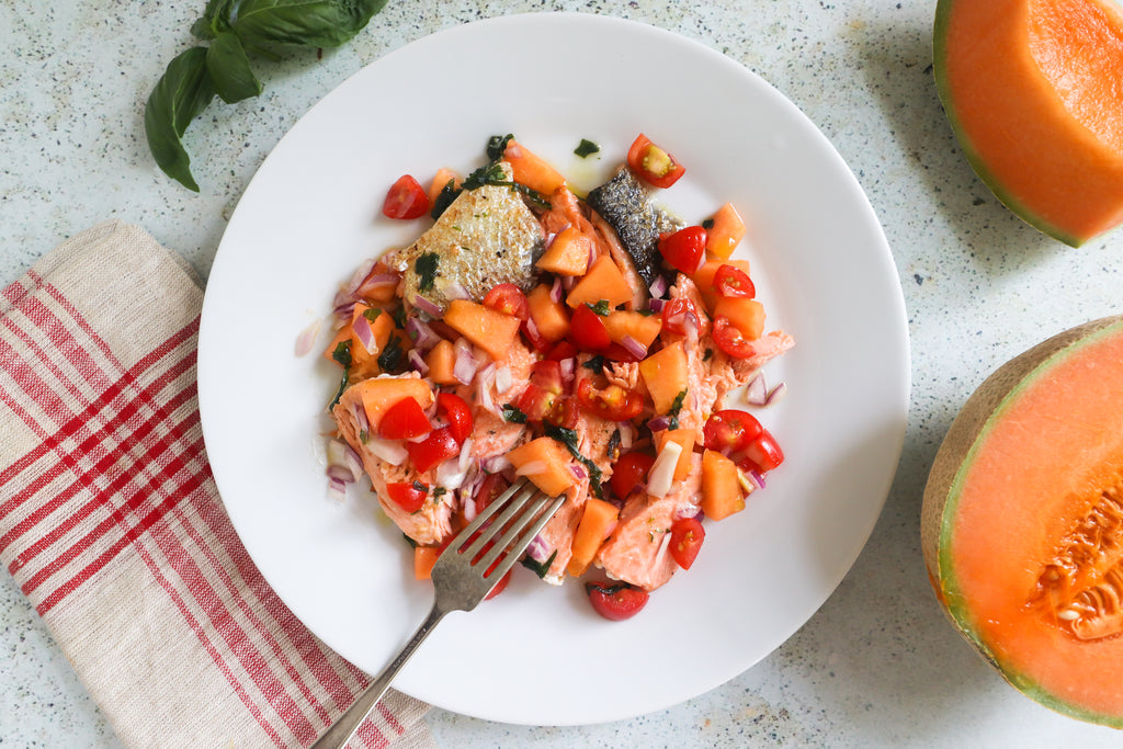 Heat oil in a large ovenproof skillet over medium-high heat. Season salmon pieces with salt and pepper. Place them in skillet, skin side down. Cook without moving, pressing gently on fillets with a spatula to ensure skin is in full contact with pan, until skin is golden and crisp, about 5 minutes. Transfer skillet to oven (do not turn fish over) and roast until salmon is just opaque in center, 3-4 minutes for medium-rare (time will depend on thickness of fish and desired doneness). Remove salmon from oven and break into smaller pieces. Divide between two plates and top with tomato melon salad.