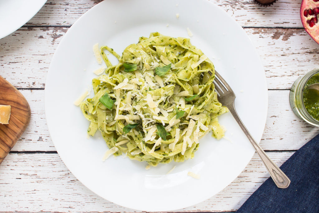 Add the pasta to the rapidly boiling water and cook until al dente, about 4-5 minutes. Strain well, reserving 1 cup cooking liquid. Return the pasta and cooking liquid to the large pot over a very low flame. Add pesto and stir gently until combined, seasoning with salt and pepper, to taste. Divide the pasta between 4 plates and serve with more grated cheese, if desired.