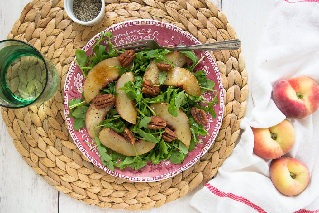 Toss arugula with dressing, plate and top with, peaches, pecans and torn basil leaves.