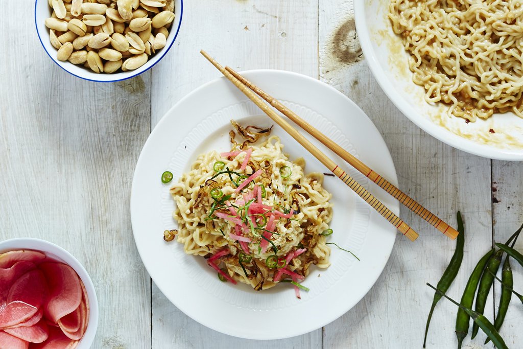 Put large pot salted water to boil. Heat cooking oil in skillet over medium-high heat. Add shallots. Cook, stirring constantly, until browned and beginning to crisp. Add soy sauce and sugar and stir quickly. Sugar will smoke a bit, but that’s ok. Cook a minute until soy sauce is absorbed. Turn off heat. Cook ramen until tender, 2-3 minutes. Toss warm noodles with peanut sauce. Add shallots and toss once more. Serve noodles garnished with sliced pickled radish.