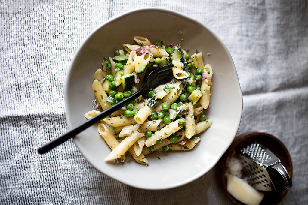 Pour in cream and simmer, stirring often (don’t boil). Stir in peas, reduce heat and simmer 2 to 3 minutes or until slightly reduced.