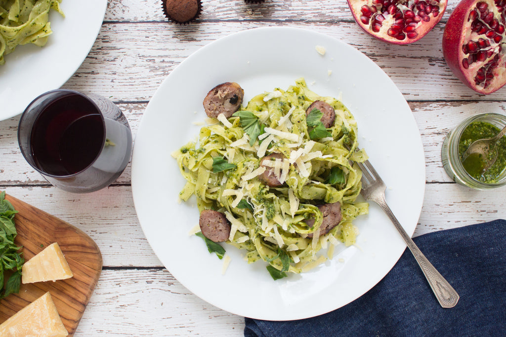 In a large sauté pan over a medium flame, heat the remaining oil until hot. Add the sausage and brown on all sides until cooked through, about 8-10 minutes. Remove to a cutting board. Add the pasta to the rapidly boiling water and cook until al dente, about 4-5 minutes. Strain well, reserving 1 cup cooking liquid. Return the pasta and cooking liquid to the large pot over a very low flame. Slice the sausage and add to the pasta along with the pesto sauce. Stir gently until combined, seasoning with salt and pepper to taste. Divide the pasta between 4 plates and serve with more grated cheese, if desired.