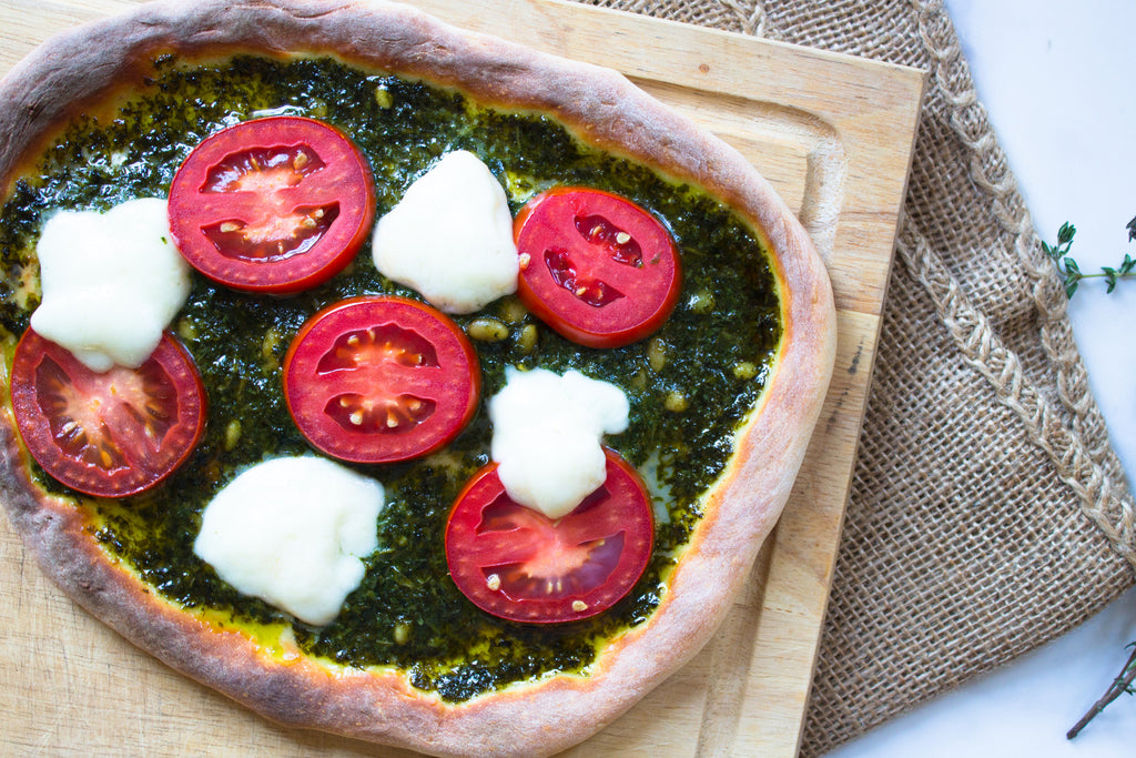 Spread the pesto onto the dough evenly, leaving room for a border crust. Top with the burrata and then the broccoli rabe and tomato. Season with a pinch of salt and place in the oven until the cheese is bubbling and the crust is golden brown. Garnish with the oregano and cut into 4.