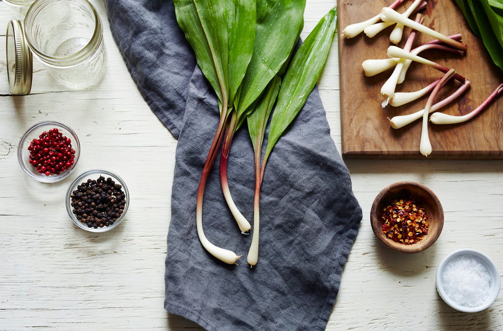 Cut green tops off ramps and save for another use. Clean bulbs and stems well, trimming off roots and washing them. Put into a mason jar with any pickling spices you like: peppercorns, a dried chile pepper, fennel seeds, etc. In saucepan, bring water, vinegar, sugar, and sea salt to boil. Pour boiling brine over ramps in jar. Allow to cool, then cover with lid. Store ramps in fridge. They’ll keep at least three weeks.