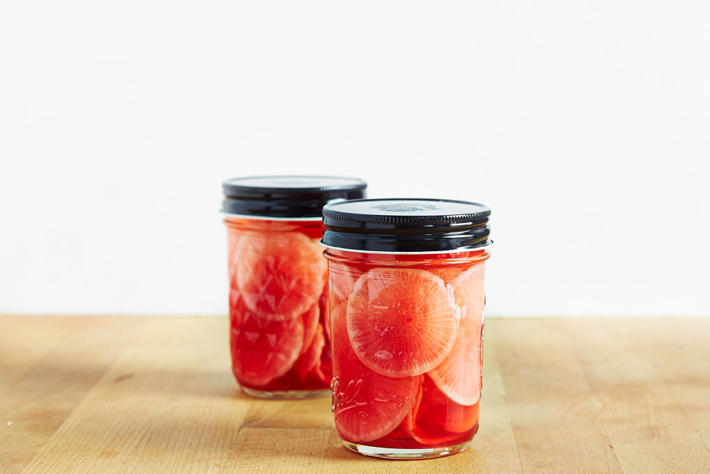 Pickled radishes have a nice bite to them. They can add zing to salads and sandwiches. And they are wonderful to serve with cheese or atop avocado toast. We love to make quick pickles to keep in fridge (as opposed to shelf-stable, hot water processed pickles that can keep in the pantry). They’re easy to make and retain some of their natural crunch. Thinly slice a watermelon radish on a mandolin. Or cut thin half-moon slices with a sharp chef’s knife. Pack sliced radish loosely into a jar. Mix together ½ cup white vinegar (apple cider vinegar works well, too), ½ cup water and ½ teaspoon sea salt. Bring to boil and pour over radishes. Let jar cool and then store in fridge. Pickled radishes keep about two weeks in fridge.