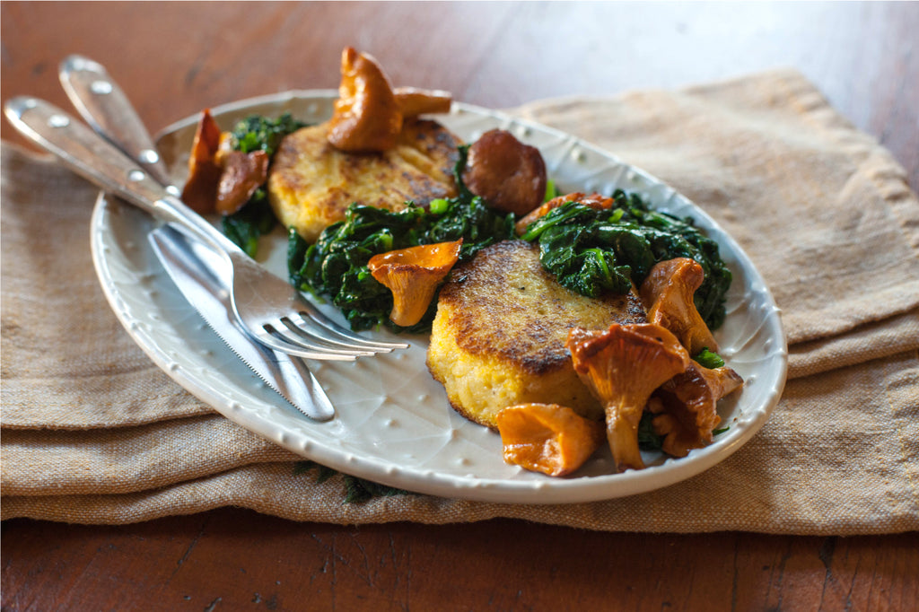 Once cool, cut polenta into four small squares or circles and set on a paper towel to dry. If you’re using leftover, cut polenta into small slices, no bigger than 3-inches square. Heat a pan over medium-high heat. Add two tablespoons of olive oil and sear cakes on both sides, until golden brown. Remove and let rest on a plate. Wipe out the pan with a paper towel. Bring to medium-high heat and add fresh olive oil. Sauté mushrooms with olive oil, a pinch of salt and a sprig of rosemary for two to three minutes until soft. Remove to a paper towel-lined plate. Return the skillet to medium-high heat and add spinach. Season lightly with a pinch of salt. Sauté until tender and wilted. Place two polenta cakes on each plate. Top with spinach, mushrooms and an additional grating of cheddar, if desired.