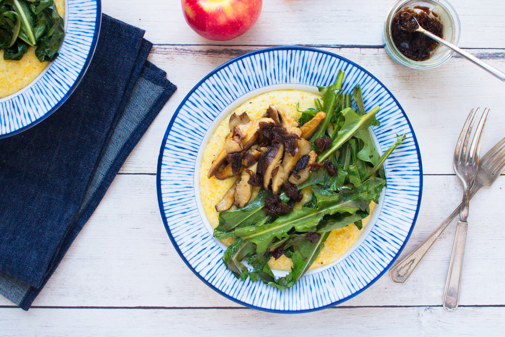 Bring a large pot of salted water to a boil over a high flame. Add the dandelion greens and blanch until tender, about 3-4 minutes. Strain and rinse under cool water. Set aside. In a large sauté pan over a medium flame, heat 1 Tbsp. oil until hot. Add the shallots and stir until translucent, about 5 minutes. Add the mushrooms and continue to stir for another 2 minutes. Reduce the flame to low and continue to cook while stirring frequently, until the mushrooms are slightly browned and completely tender, about 8 minutes. Add the greens to the pan when the mushrooms are 2 minutes from being finished. Remove from heat and set aside. Meanwhile, in a sauce pan over a medium flame, bring 2 1/2 cups of water to a boil. Slowly whisk in the polenta along with a pinch of salt. Reduce the flame to low and continue whisking until the polenta is tender and thickened, about 15 minutes. At the last minute, whisk in the remaining oil along with the caramelized onions. Divide the polenta between 2 plates. Top evenly with the greens and mushrooms. Garnish with the cheese, if desired.