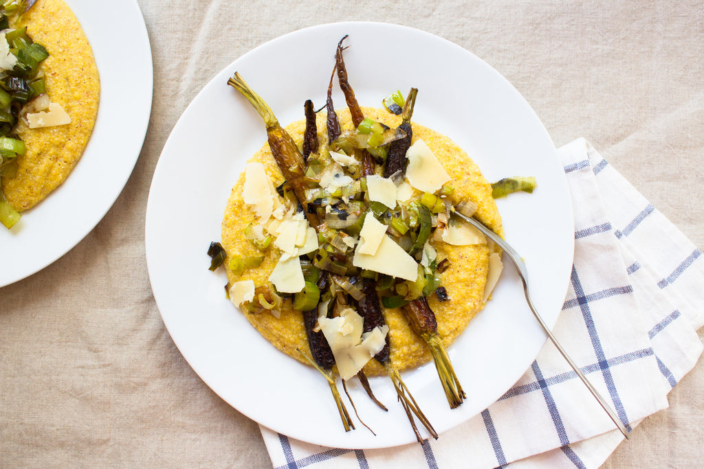 Divide the polenta among 4 plates. Top evenly with the roasted carrots and leeks. Garnish each plate with Gruyère.