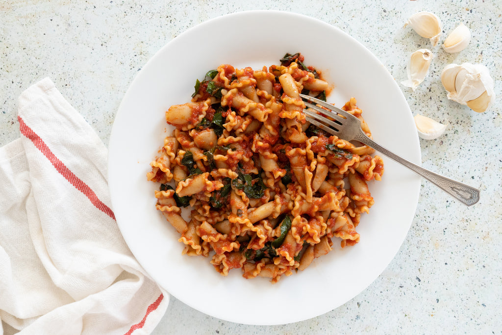 Drain pasta, reserving some of the water. Add trumpets to the pot with the tomato sauce over very gentle heat. Add the young chard and mix until chard is wilted. If the mixture seems too thick, add a bit of the pasta water. Taste and adjust for seasoning.