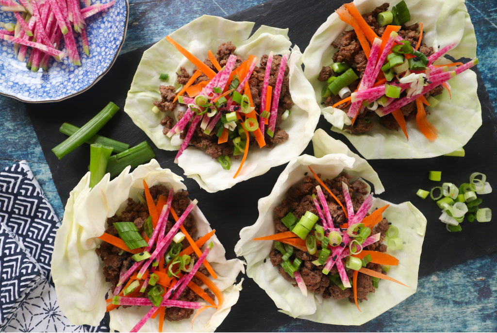 Add a couple spoonfuls of the mixture to each cabbage leaf cup and top with the carrot, daikon and more sliced scallions.
