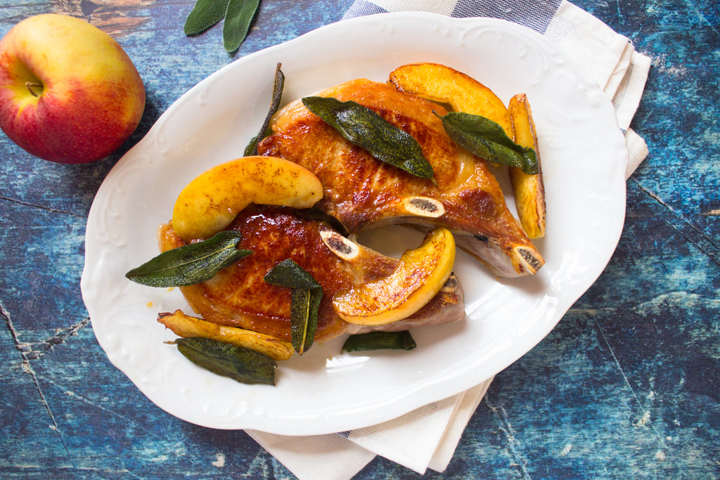 Melt ghee in the pan and add apples slices. Brown the apples slices, 2 to 3 minutes per side. Top the apples with the sage leaves and place the seared pork chops on top of the apples.