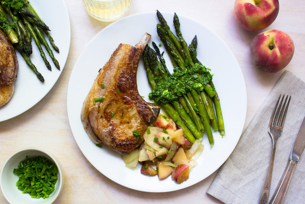To serve, top asparagus with parsley sauce and enjoy pork chops with the apple chutney, either on the side or on top!