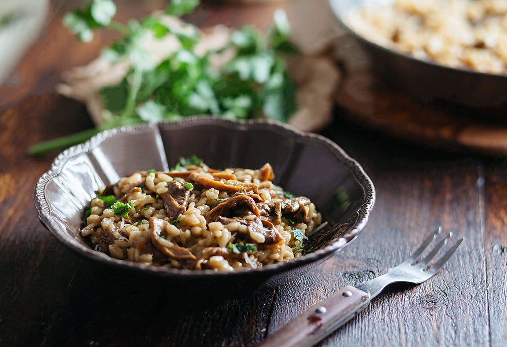 In a medium pot, heat olive oil over medium heat. Add onions and cook, stirring often, until softened and translucent. Stir in garlic and rosemary. Cook 1 minute, until fragrant. Add mushrooms and cook until they soften and darken in color. Stir in rice and cook until translucent. While stirring continuously, pour in wine. Cook until liquid disappears, then add warm stock, 1/2 cup at a time, waiting until stock is reduced and thickened before adding more. Stir constantly 15-20 minutes, until rice is tender.