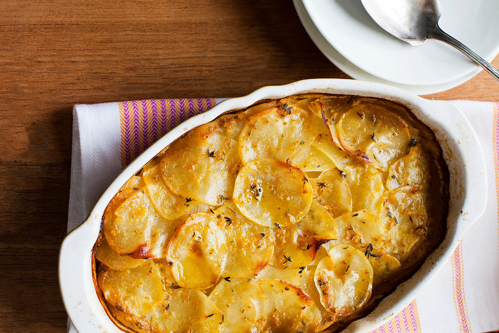 Preheat oven to 375 degrees. Rub inside of 2-quart gratin or baking dish with cut side of garlic and lightly coat with olive oil or butter. Slice any garlic that remains and toss with potatoes, squash, half of cheese, generous amount of sea salt and pepper, and chopped rosemary, if desired. Arrange potato and squash slices in even layer and continue to layer evenly.