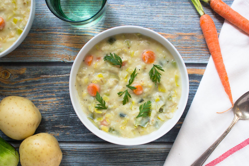 Add potatoes to a large pot of water so they are fully submerged. Bring to a boil and cook until fork tender. Drain about half the water into a separate bowl; set aside. Add cream to potatoes and mash until fairly smooth. Add leeks and carrots and bring to a simmer. You should have a soupy consistency. If it is too thick, add some of the reserved potato water to liquify. Cook at a low simmer for 15 minutes, stirring occasionally until carrots are tender. Season with a ¼ tsp nutmeg, a good amount of salt and pepper, and serve.