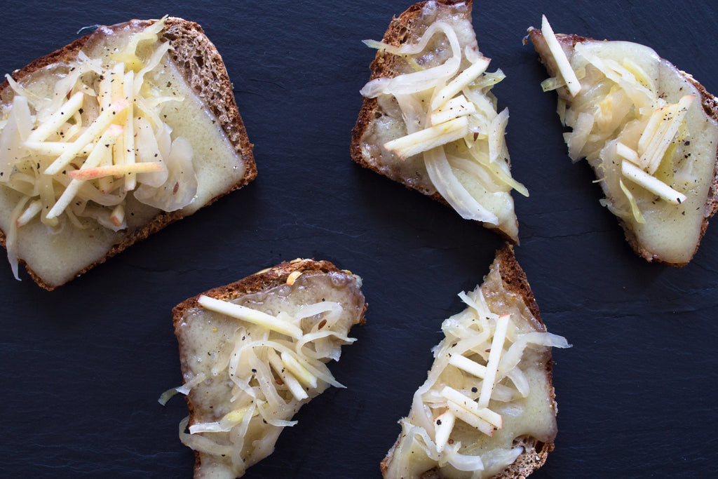 Ingredients:Preheat an oven to 400 degrees. Place the bread on a sheet tray and top each slice with about 1 ounce Raclette. Bake until browned, about 12 minutes. Remove from the oven and top with sliced apple and sauerkraut.