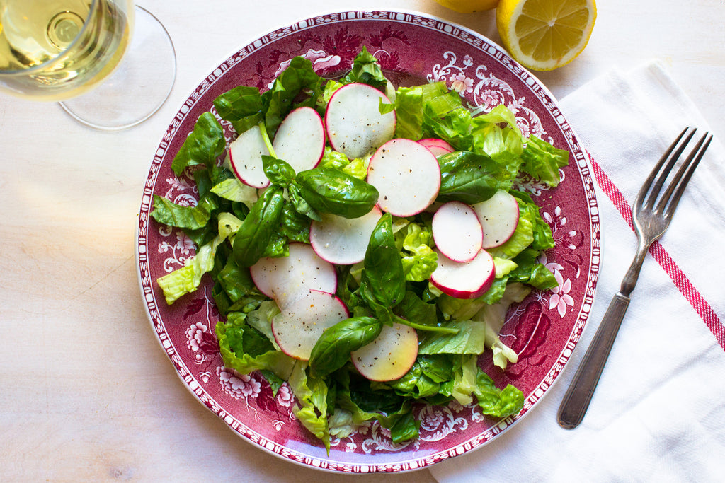 Toss radish greens, romaine and basil together with the dressed radishes. Serve with the remaining dressing on the side, for each diner to add to taste.