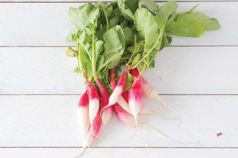 Wash and trim radishes. Cut in half and roughly chop greens.