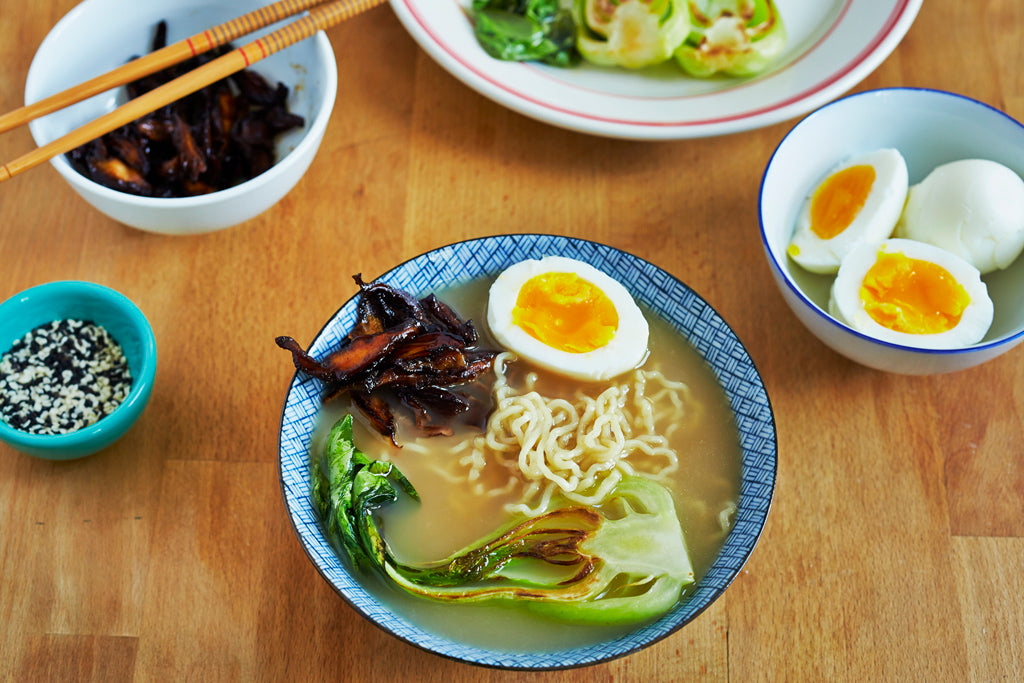 When broth has simmered 30 minutes, turn off heat, stir in soy sauce and miso. Pour broth over noodles and stir in kimchi liquid, if using. Top with bok choy, soft boiled eggs, and sesame seeds, if desired; serve.