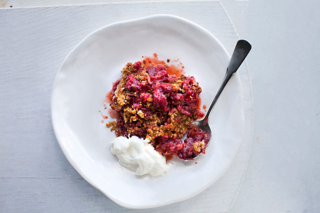 In a small bowl, combine the oats, brown sugar, butter, flour and cinnamon until the mixture resembles coarse crumbs. Sprinkle over fruit. Bake until crisp is bubbly and rhubarb is tender, about 45 minutes. Serve warm with a large spoonful of coconut yogurt.
