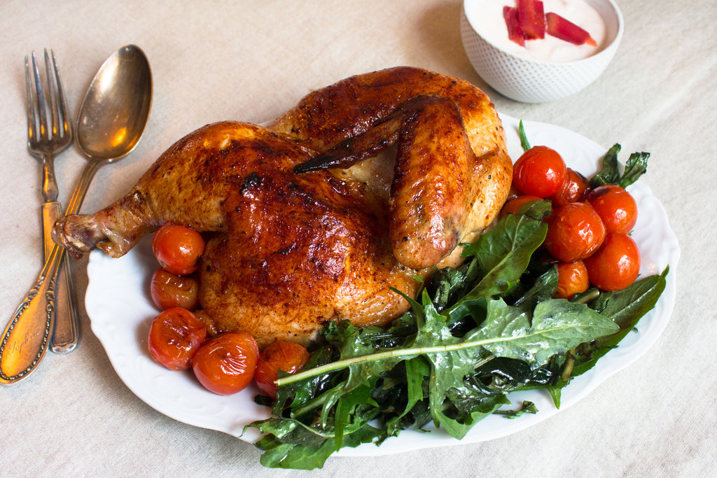 Place chicken skin side up in a baking dish. Use your fingers to gently separate skin from the meat, careful not to tear. Use your fingers to rub the rhubarb butter between skin and meat. Drizzle the skin with olive oil and 1 Tbsp. of the rhubarb cooking liquid. Season with salt and pepper.