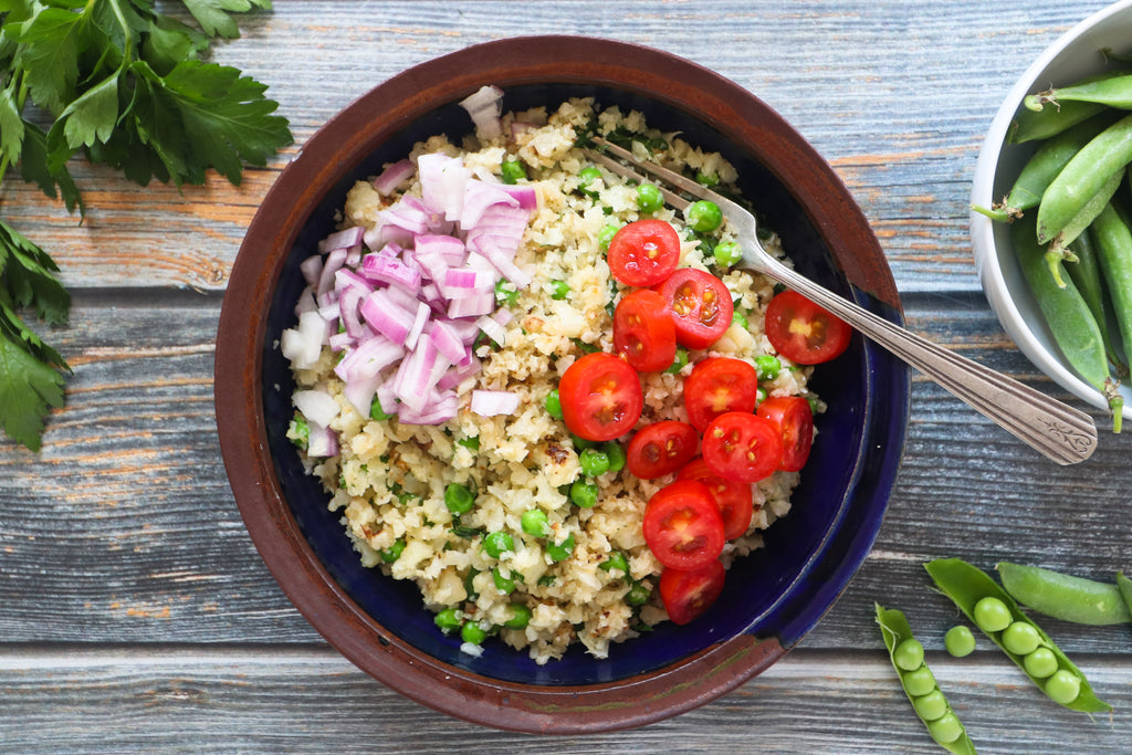 Heat the oil in a large skillet over medium-high heat. At the first wisp of smoke from the oil, add the onions and celery and stir to coat. Continue cooking, stirring frequently, until the onions are golden brown at the edges and have softened, about 8 minutes. Add the cauliflower, and stir to combine. Add 1 teaspoon salt, and continue to cook, stirring frequently, until the cauliflower has softened, 3 to 5 minutes. Stir in parsley and peas. Remove from heat. Season with salt and pepper to taste. Divide between two bowls and top with sliced cherry tomatoes.