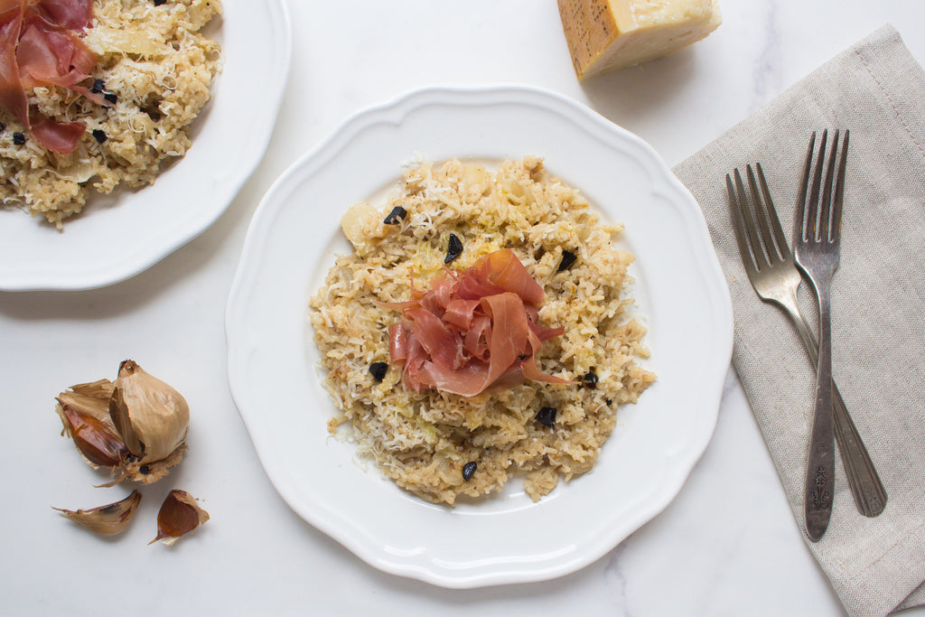Add one ladle of broth and the rosemary and stir. Allow the rice to cook uncovered, at a simmer. When the broth has been almost entirely soaked up by the rice, add another ladle. Continue this cycle until the rice is cooked al dente. This will take about 20 minutes, and you might have leftover broth. Stir in the parmesan and prosciutto. Add salt and pepper to taste. Serve with a splash of the black garlic oil.
