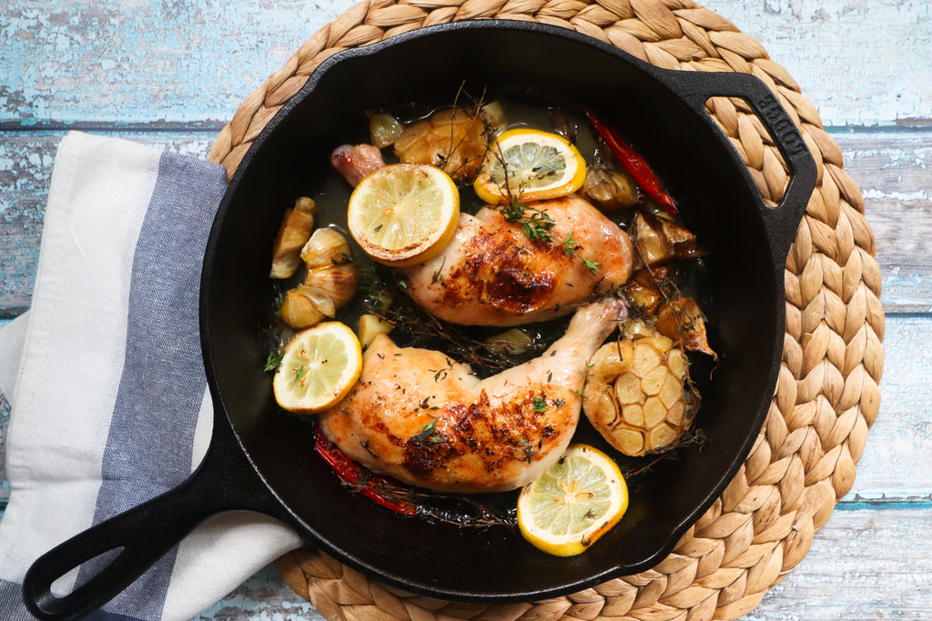Preheat oven to 325 degrees. Place chicken in an small baking dish and season generously all over with salt. Add garlic, lemon, thyme, chili, if using and a few grinds of pepper. Pour in oil and toss everything to coat. Turn garlic heads cut side down.
