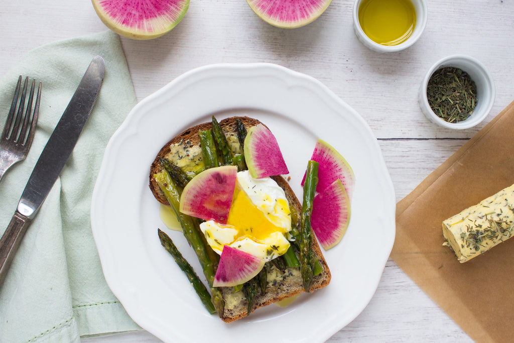 Spread a small amount of the herb butter on each piece of toast. Divide evenly between 2 plates. Top each toast with a poached egg, asparagus and radish. Season with a pinch of salt and pepper to taste.