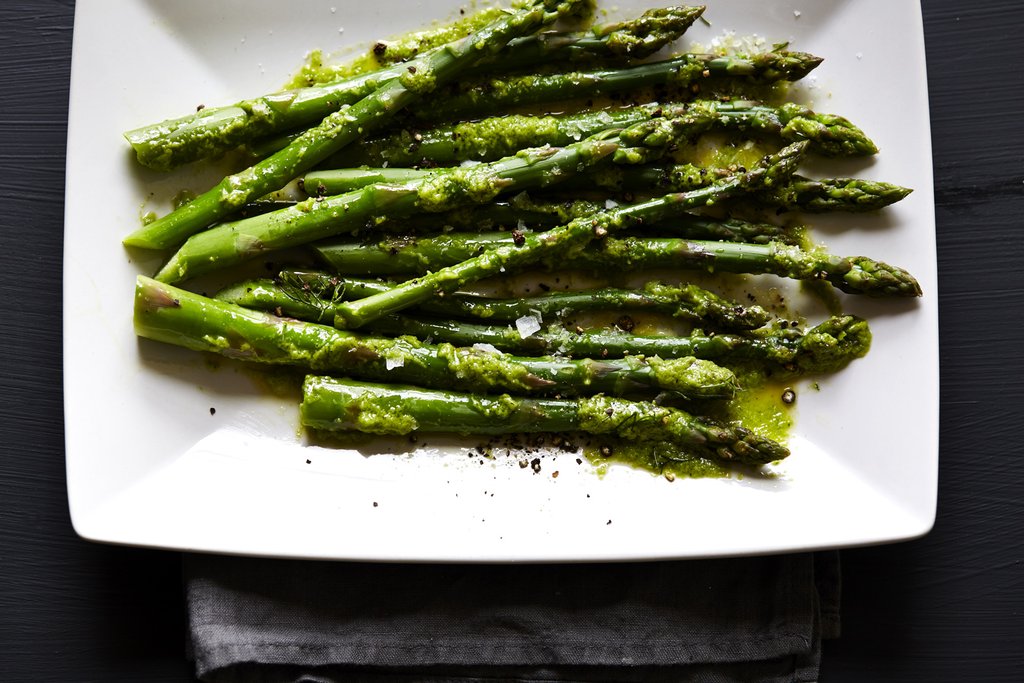Bake 12 to 15 minutes, depending on thickness, until tips begin to turn crispy and stalks are tender.