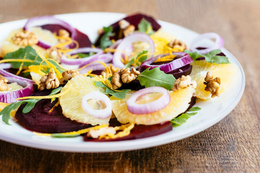 Cut cooled beets into 1/4-inch-thick rounds. Arrange beets and orange slices on a platter. Top with shallot or onion slices, frisée, or greens and chopped nuts. Drizzle with dressing and serve.