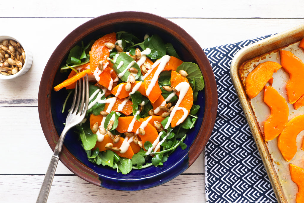 Meanwhile, whisk together the crème fraîche, tahini, lemon juice, 2 tablespoons water and a pinch of salt. The sauce should be thick but runny enough to pour; add more water, if necessary. I always have to add at least 2 tablespoons, sometimes even more. Serve roasted squash on top of watercress; drizzle with crème fraîche sauce and sprinkle with squash seeds.