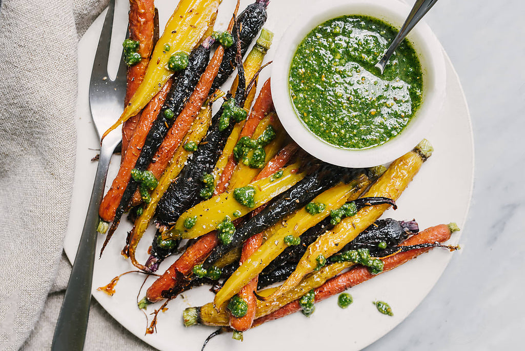 Preheat oven to 400 degrees. Trim carrot tops, leaving some stem attached. Reserve 2 cups carrot tops.