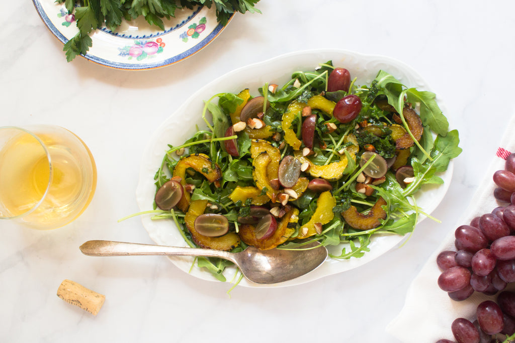 In a small bowl, whisk together 2 Tbsp. olive oil, mustard, lemon juice and garlic. Season with salt and pepper. Toss greens with dressing and plate. Top with roasted squash, grapes and almonds.