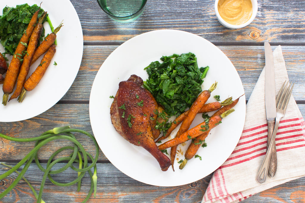 Whisk together mustard, honey, oil and garlic in a small bowl. Lay duck legs on a baking sheet with carrots and coat with marinade. Roast for 30 minutes or until duck legs are cooked through. Remove from oven. Heat about 2 Tbsp. of the duck fat in a medium sauté pan. Add mustard greens and sauté for about 2 minutes or until wilted. Season with salt and pepper to taste. Serve duck legs with wilted greens and roasted carrots.