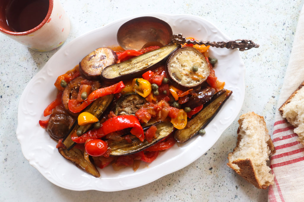 While eggplant bakes, coat bottom of large skillet with 1 tablespoon olive oil and place over medium heat. Add onions and bell peppers. Sauté 5 minutes, or until tender. Add garlic and sauté 1 minute more. Add wine and bring to simmer. Allow to cook 3 to 4 minutes, until liquid is reduced by half. Add cherry tomatoes, crushed tomatoes, capers, rosemary, oregano, and red pepper flakes to skillet. Stir and bring to simmer. Cook 5 minutes. Gently stir roasted eggplant into mixture and return to simmer. Allow to cook 5 minutes more, until all veggies are tender and sauce thickens. Remove from heat and season with sea salt and pepper, to taste. Serve with crusty bread or over pasta.