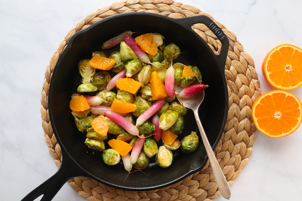 Cut sprouts in half. Heat 1 tablespoon oil in a cast-iron skillet on high heat and add Brussels facedown. Sear for 3 minutes. Add radishes. Sprinkle with salt, transfer to oven and roast for 15 minutes. Whisk together the rest of the olive oil, honey, ginger and vinegar. When veggies are done, toss with tangelos and dressing; and serve.