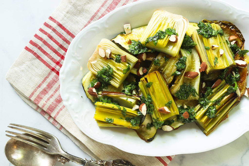 Remove leeks from oven; transfer to a serving platter; drizzle with gremolata and sprinkle with chopped toasted nuts; then, serve.