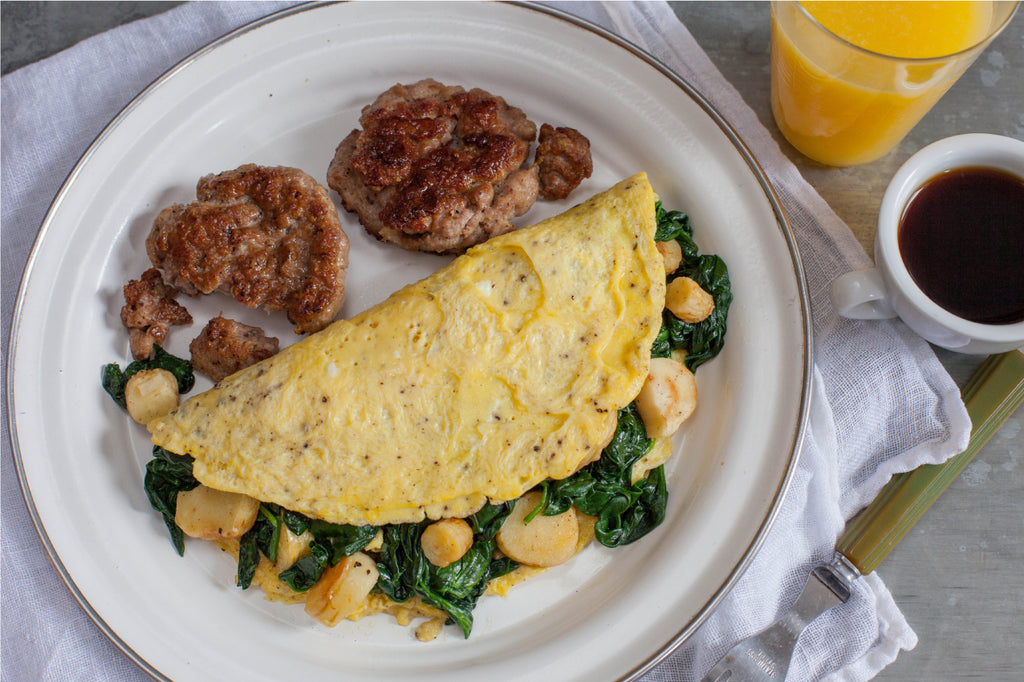 Wash and dry the greens. Sauté them in the olive oil with the garlic. Set aside. Form country sausage into 8 mini breakfast patties and cook in a pan over medium-low heat. Meanwhile, crack eggs into a bowl and whisk with a fork, adding 1 tablespoon water, salt and pepper. In a small skillet, heat ghee over medium heat. Add eggs. Let them cook 15 seconds until the edge is set. Use a spatula to gently move around the eggs, pushing aside the cooked part to let the uncooked portion reach the pan. While eggs are still a bit wet, scatter the parsnips and greens on them. Fold the omelet over the filling and cook for another 30 seconds. Turn the omelette onto a plate and divide. Serve with the sausage.