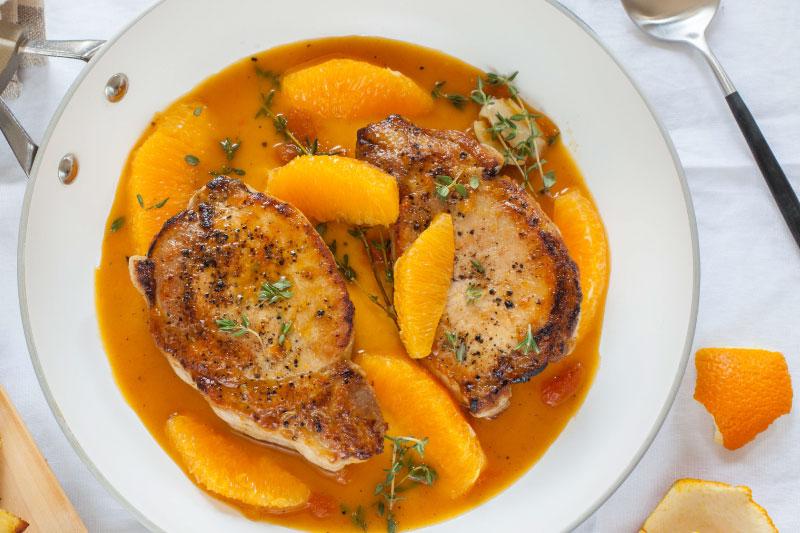 Juice one orange and chop garlic. Combine orange juice and garlic with soy sauce, a few grounds of black pepper and a few sprigs of thyme, if using. Add pork chops and marinate at least 1 hour or up to overnight, turning occasionally.